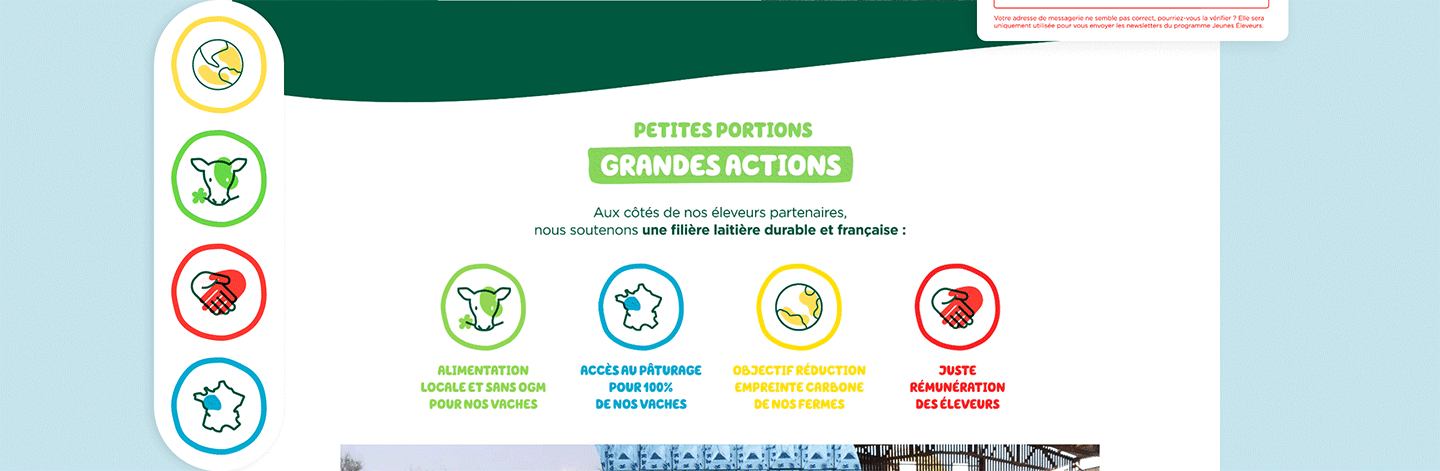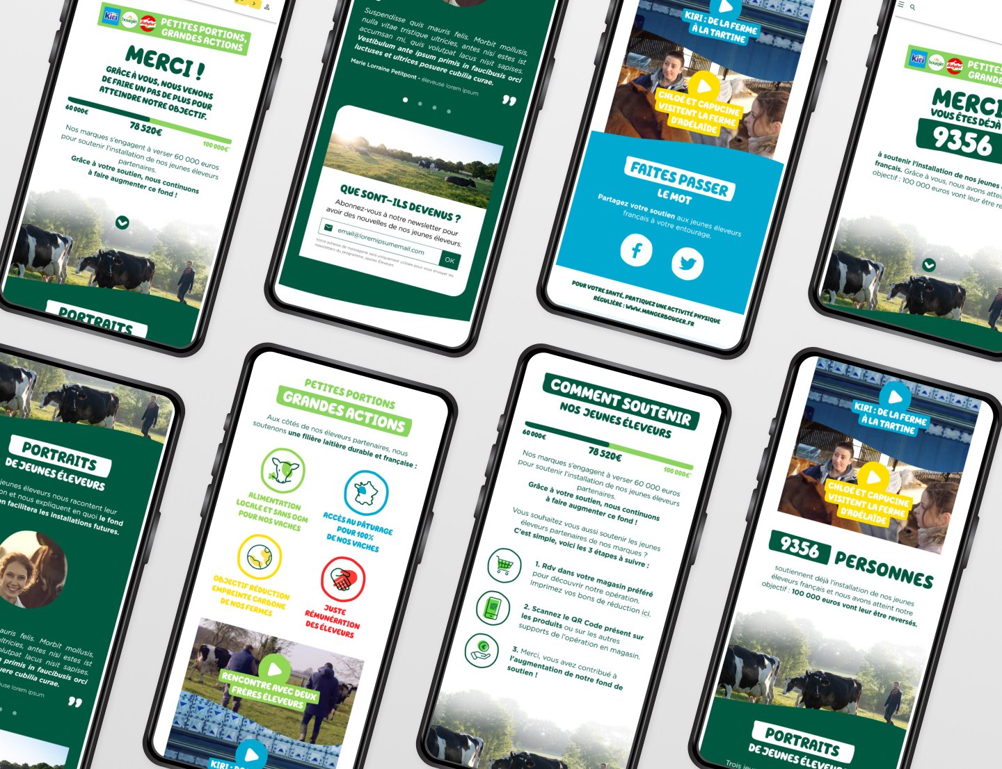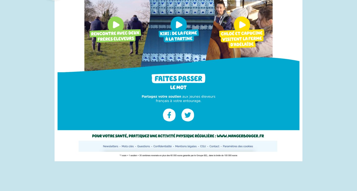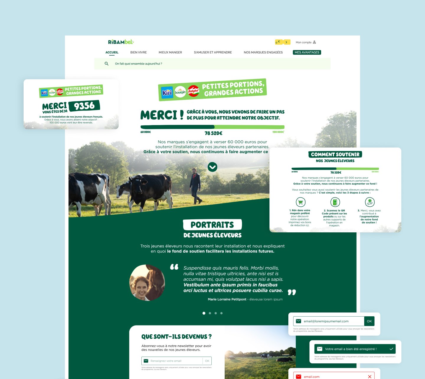 La landing page “Petites portions, grandes actions” a été réalisée pour promouvoir une aide financière accordée aux jeunes éleveurs partenaires des marques Bel. Scanner des QR codes en supermarché aidait à faire augmenter une cagnotte, dont le suivi pouvait être observé sur la landing, couplé à une présentation de ces jeunes éleveurs ainsi que d’autres initiatives de la marque.