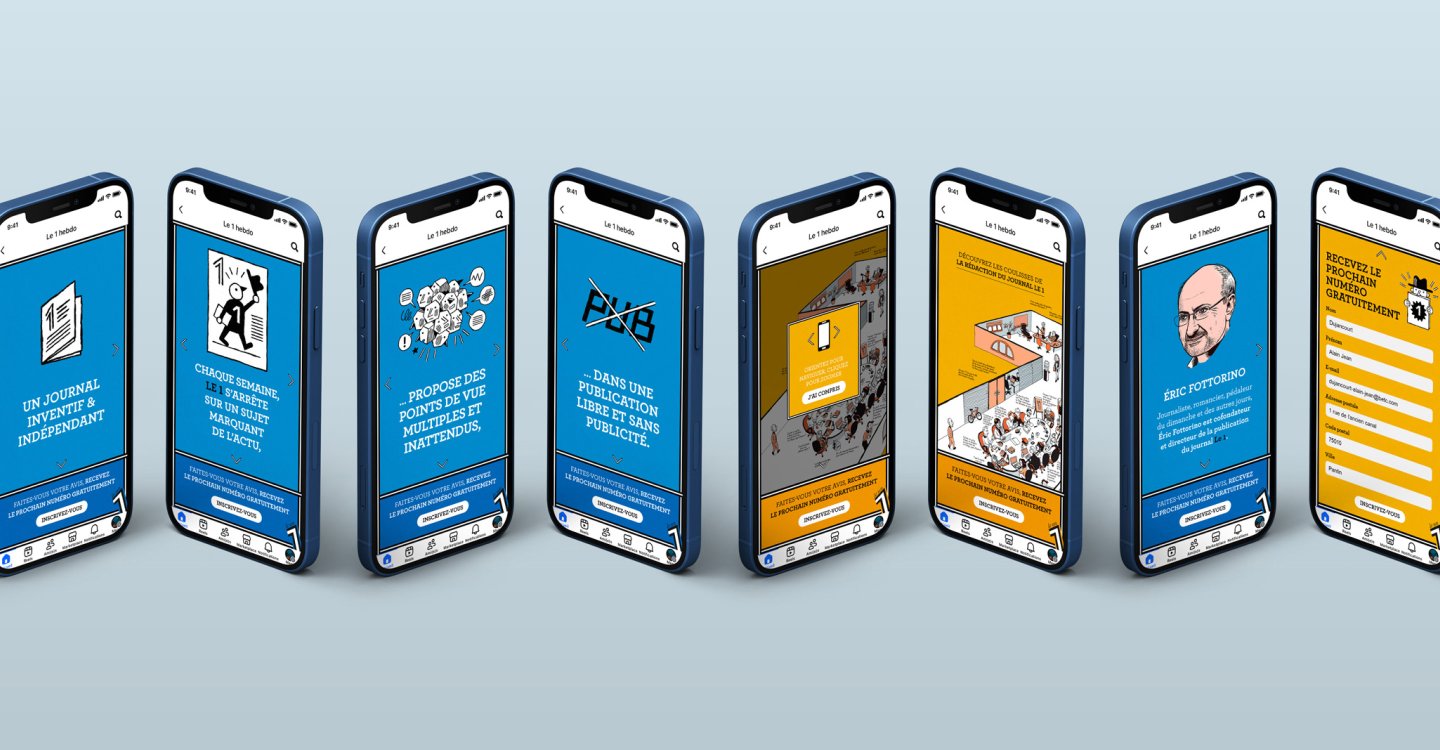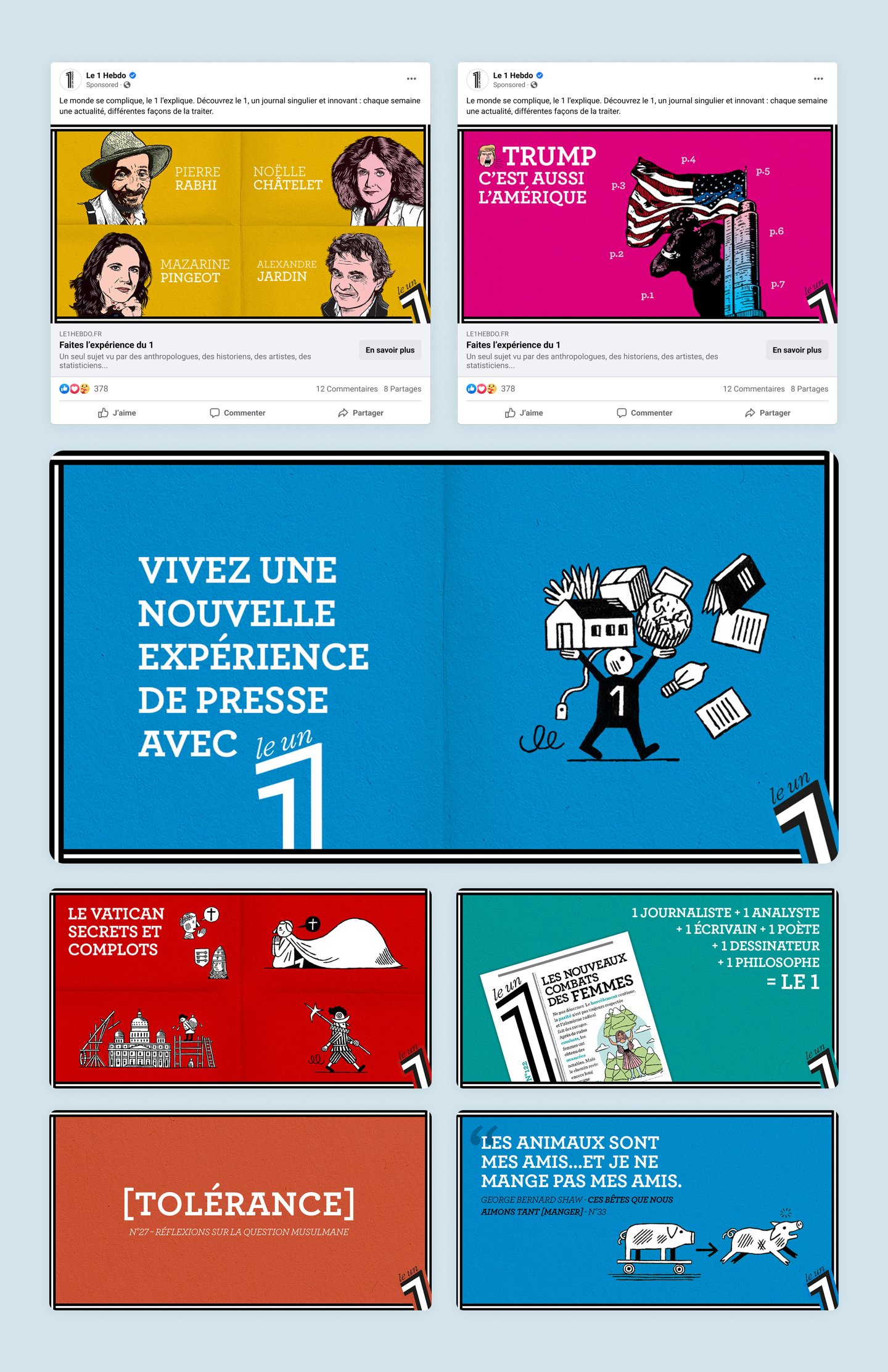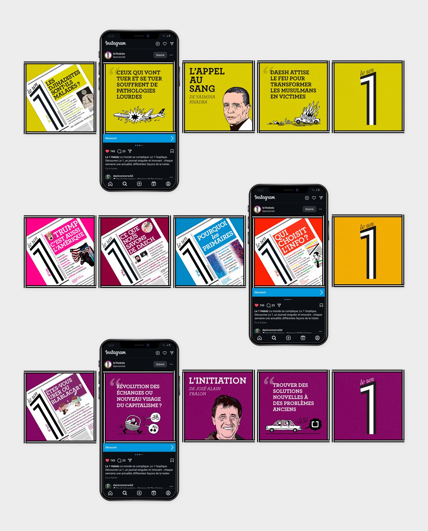 Dans le cadre de la refonte du design des publications du journal Le 1 sur les réseaux sociaux, il s’agissait ici de dégager des codants forts visuellement, à même de faire ressortir les posts dans le flux. Il s’agissait également de produire à titre d’exemple des posts classiques, des carrousels ainsi que des formats inhabituels comme un Canvas.