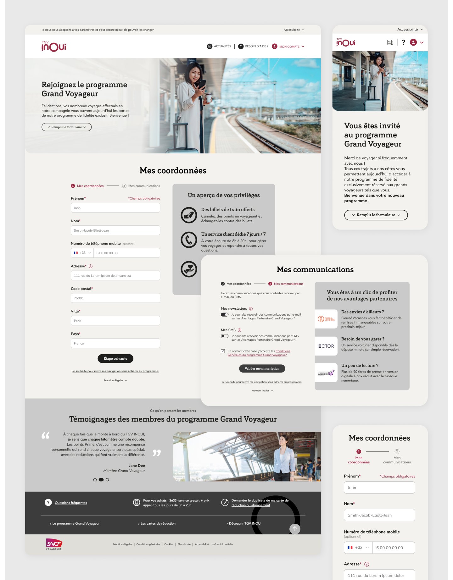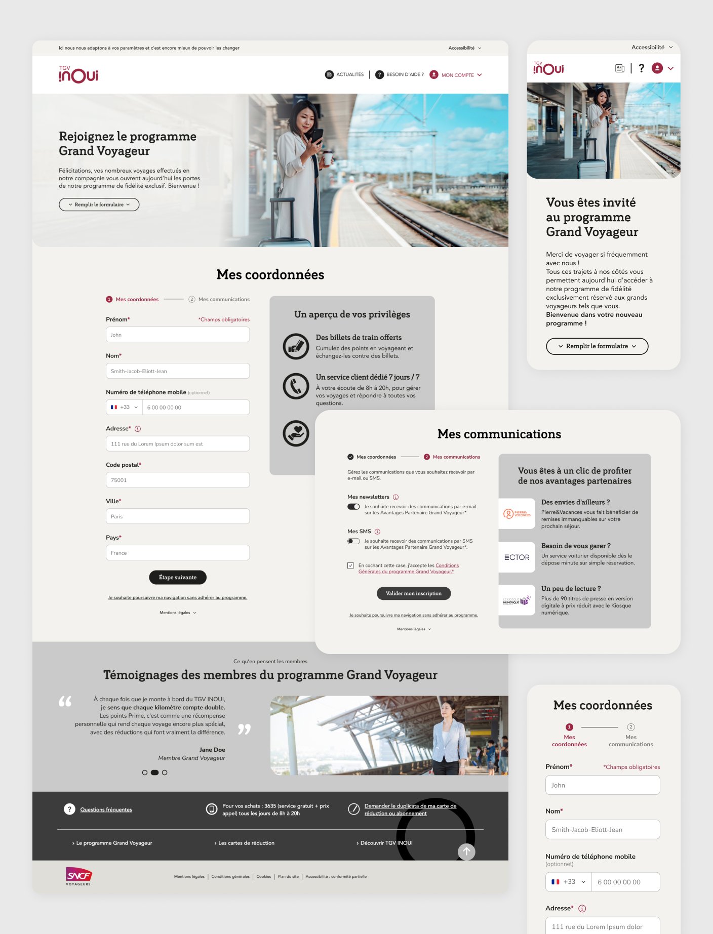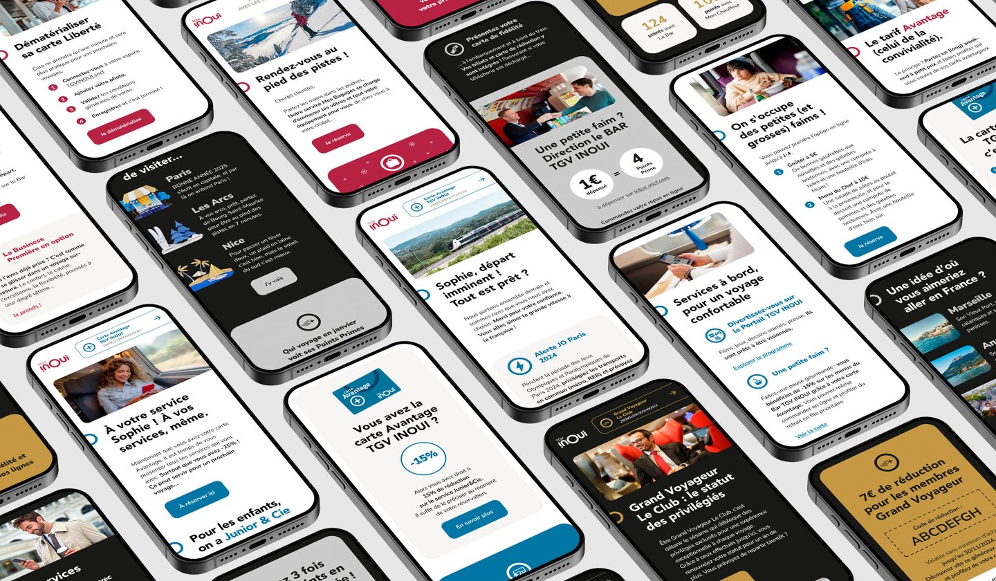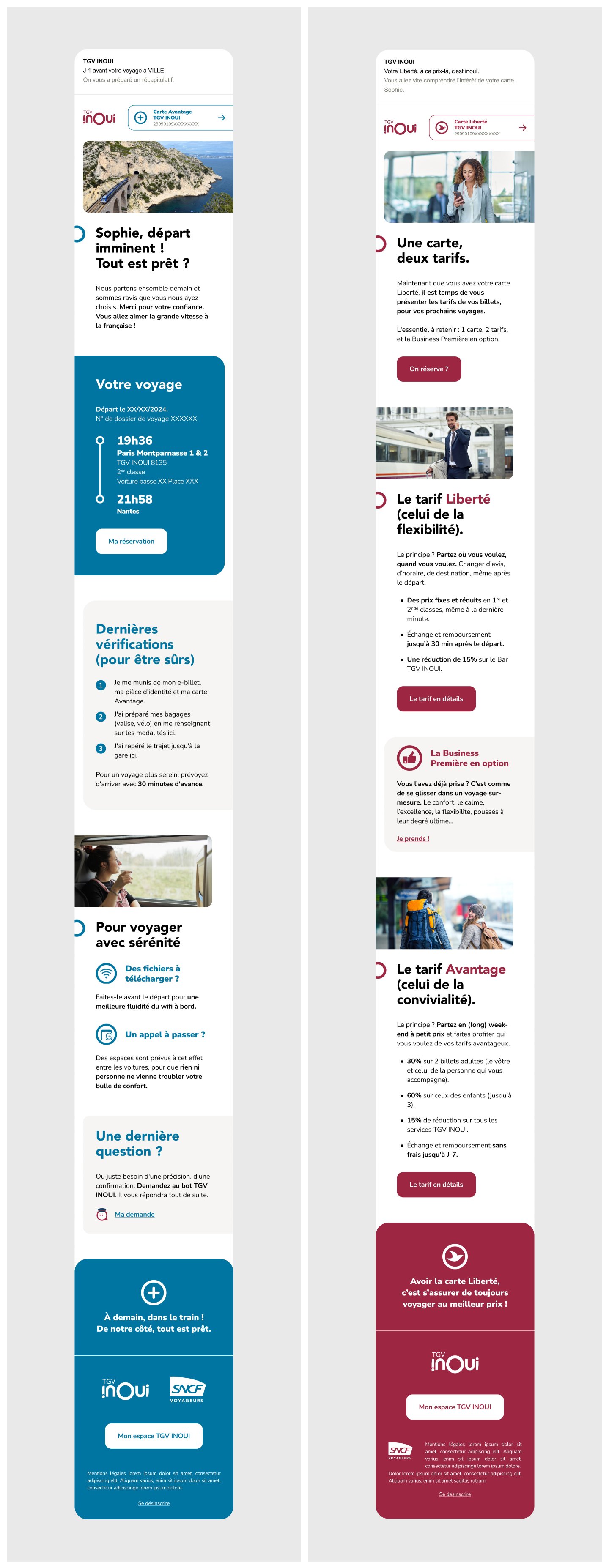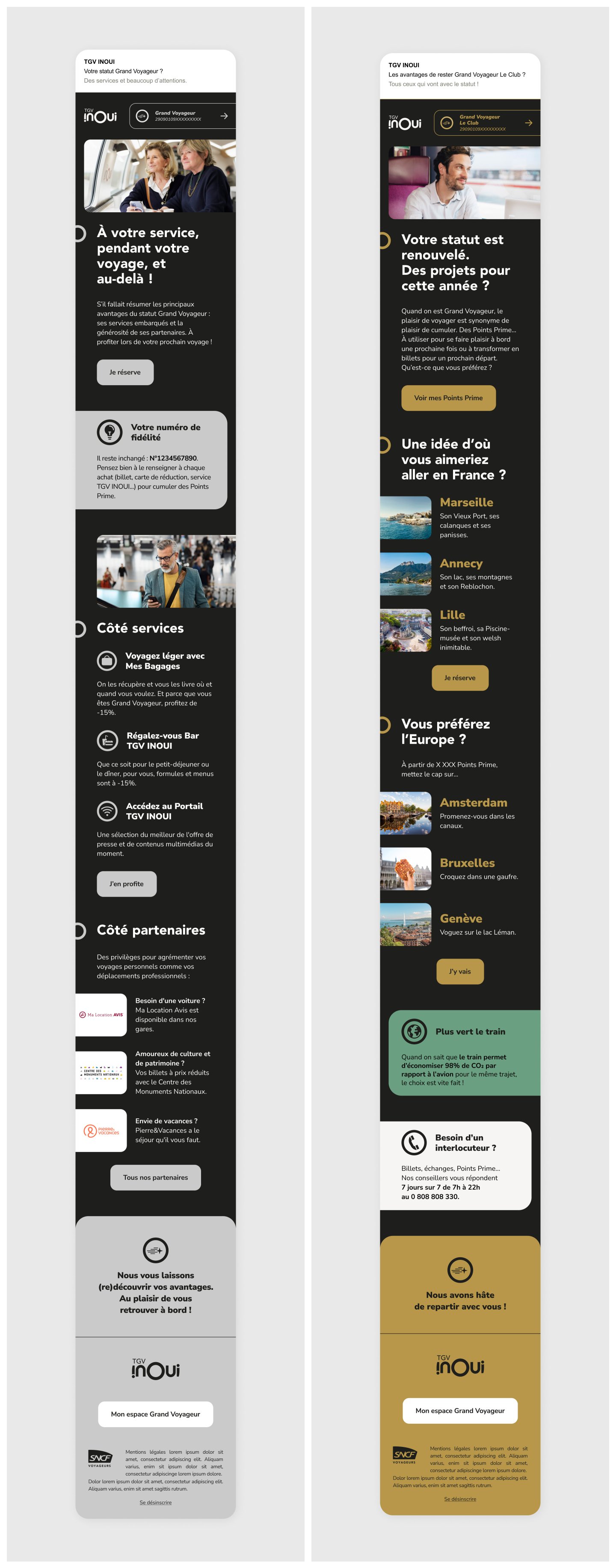 Dans le cadre de la refonte totale de la charte TGV INOUI (développée sur une autre page), il s’agissait ici d’entièrement revoir les Cycles de vie du programme CRM (cartes Avantage, Liberté, Grand Voyageur et Grand Voyageur Le Club). Les parcours ont été repensés, l’inscription et les communications envoyées également. Voici quelques exemples des nombreux emails réalisés.